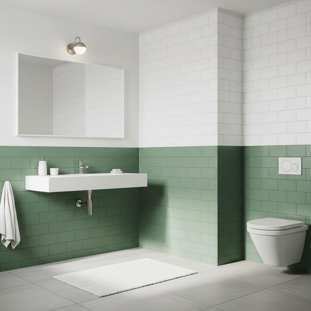 Color blocking with tiles means using solid colors in distinct sections rather than mixing them throughout. You might have the bottom half of your walls in deep green and the top half in white, or one wall in blush pink with others in gray.