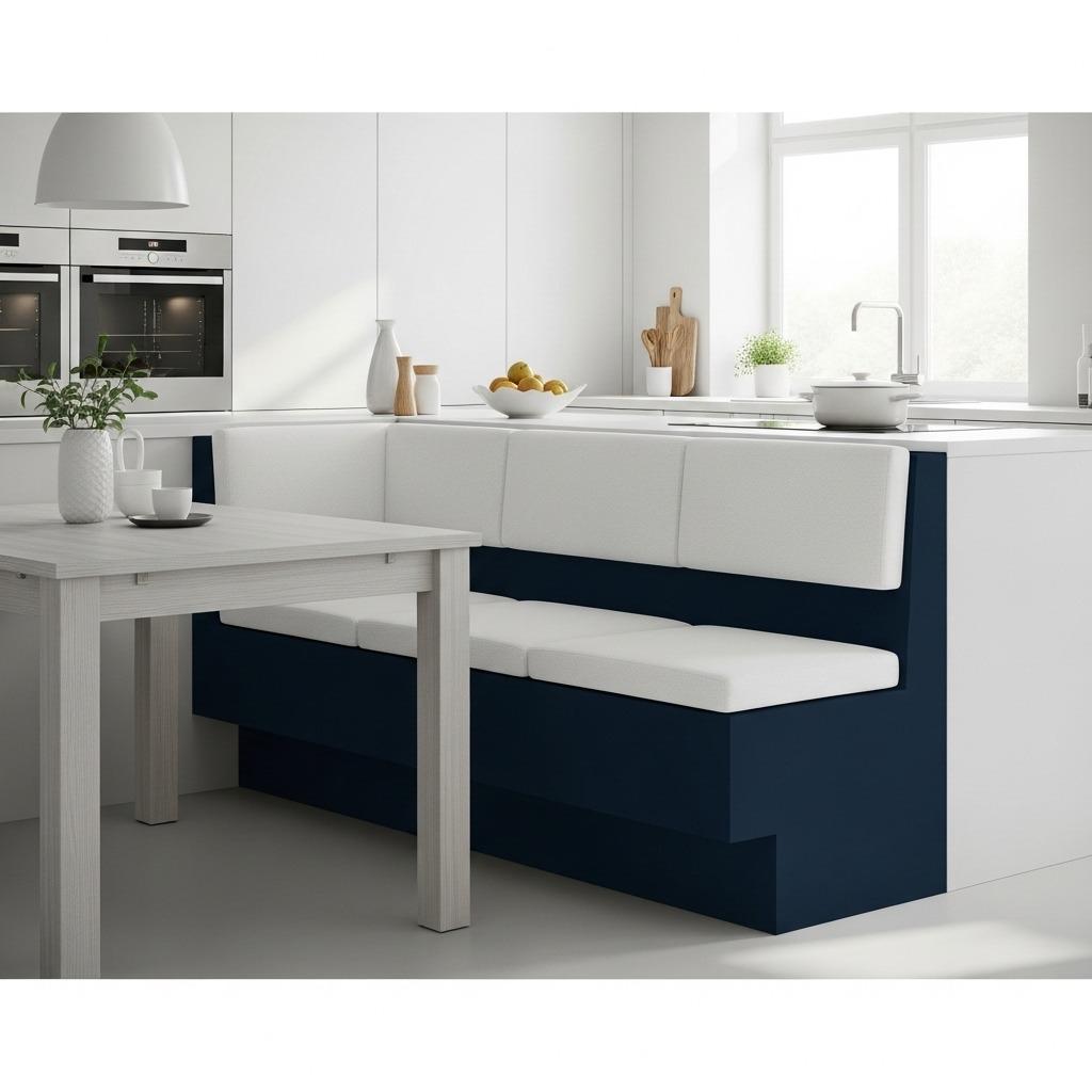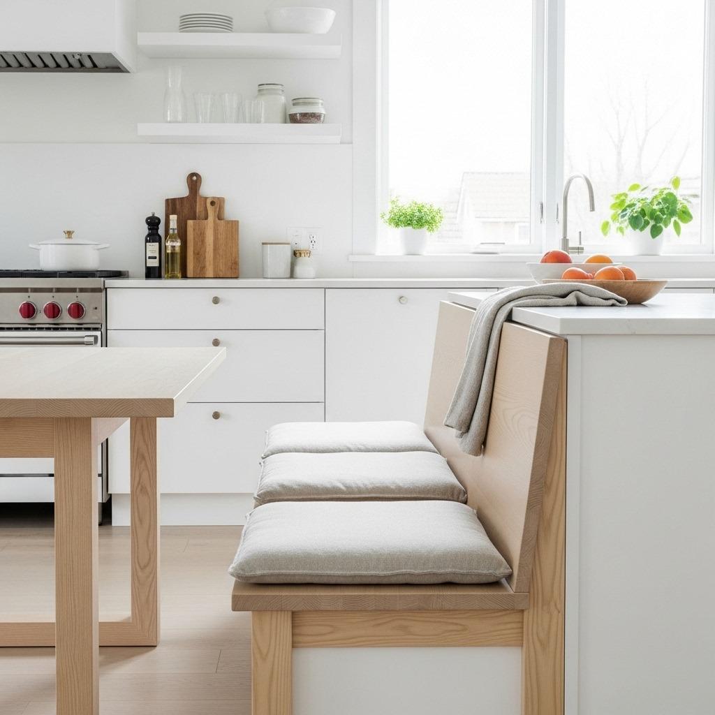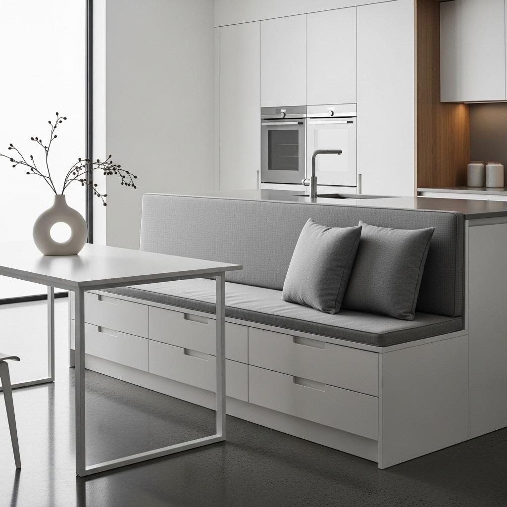 The minimalist aesthetic keeps things from feeling too furniture-heavy. Simple lines, neutral cushions, and integrated storage create a streamlined look that works whether your kitchen leans modern or transitional.