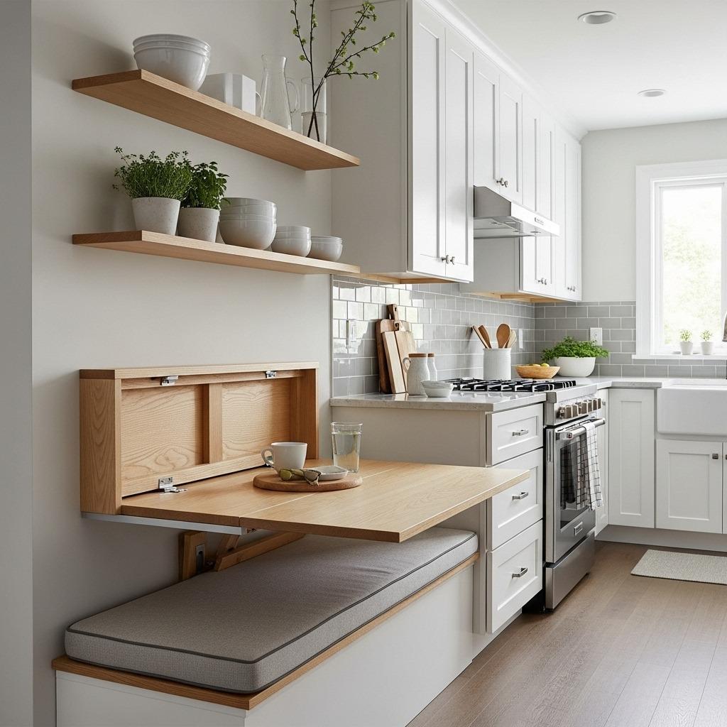 Pairing this slim banquette with a wall-mounted or fold-down table adds flexibility. When you’re not eating, the table folds up or swings away, opening the galley completely. This transformable approach suits compact dining table strategies where flexibility matters more than permanent setup.
