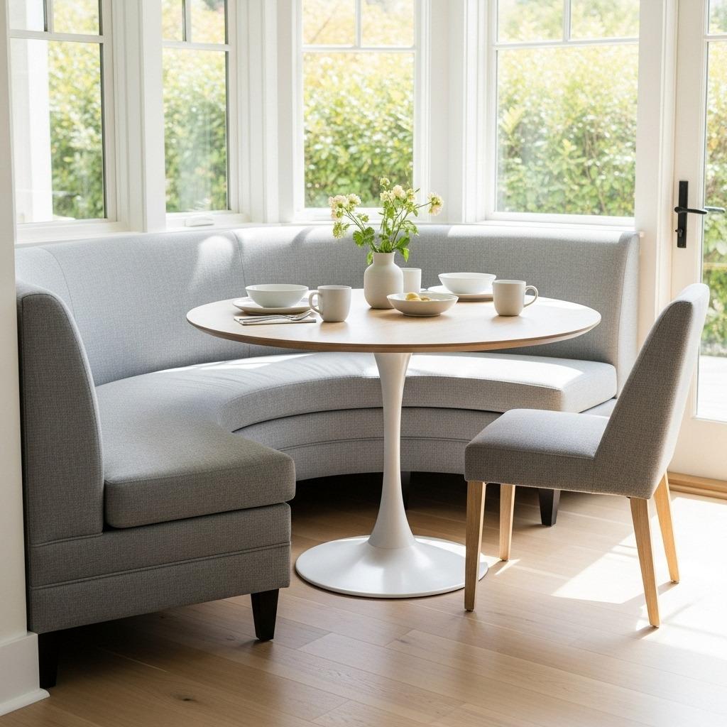 Curved banquettes create flow in ways straight lines can’t match. When you wrap seating around a round or oval table, the whole arrangement feels more conversational and less formal. This configuration works particularly well in modern breakfast nook designs where the goal is creating an intimate gathering spot.