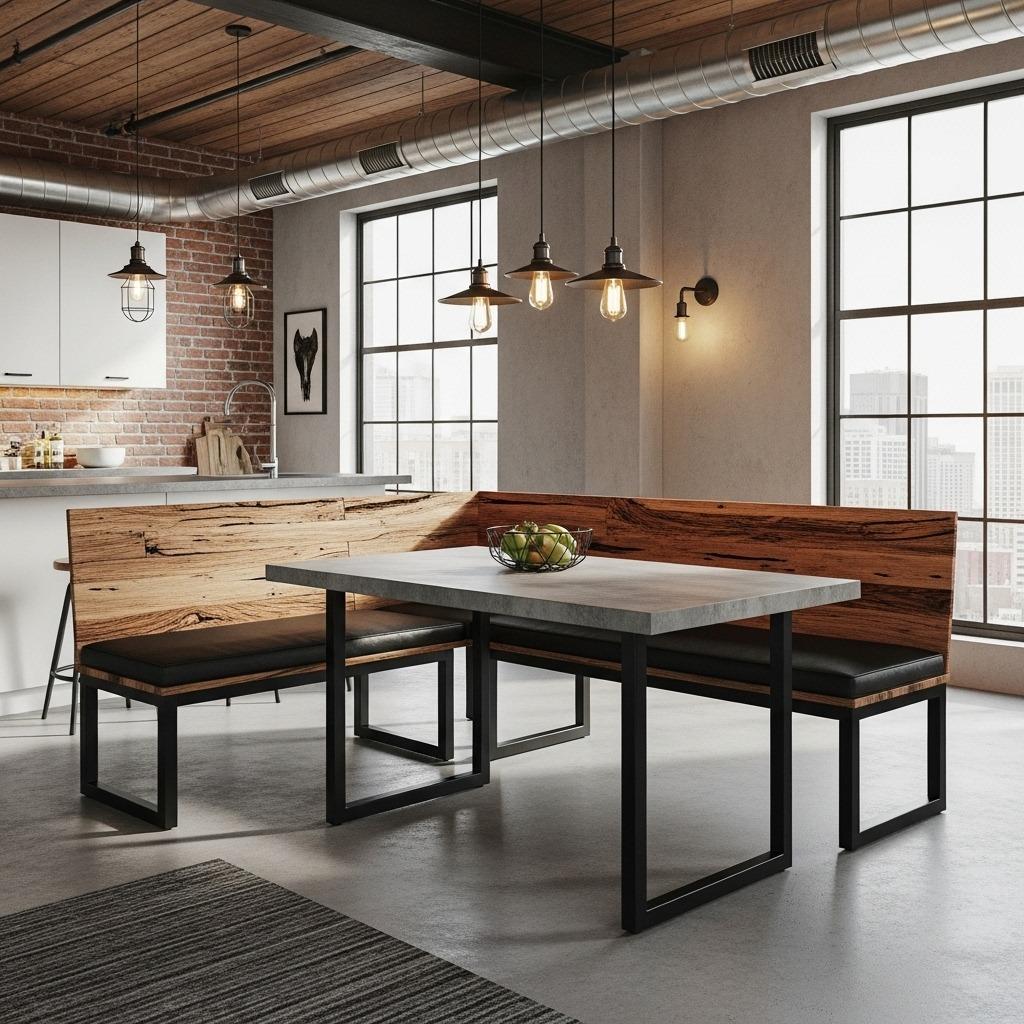 Metal framework brings an entirely different aesthetic to kitchen banquettes. Exposed steel or iron legs create an airy, less built-in feeling while still providing structure. This approach suits industrial loft bedroom and open-plan spaces where the industrial style carries through multiple areas.
