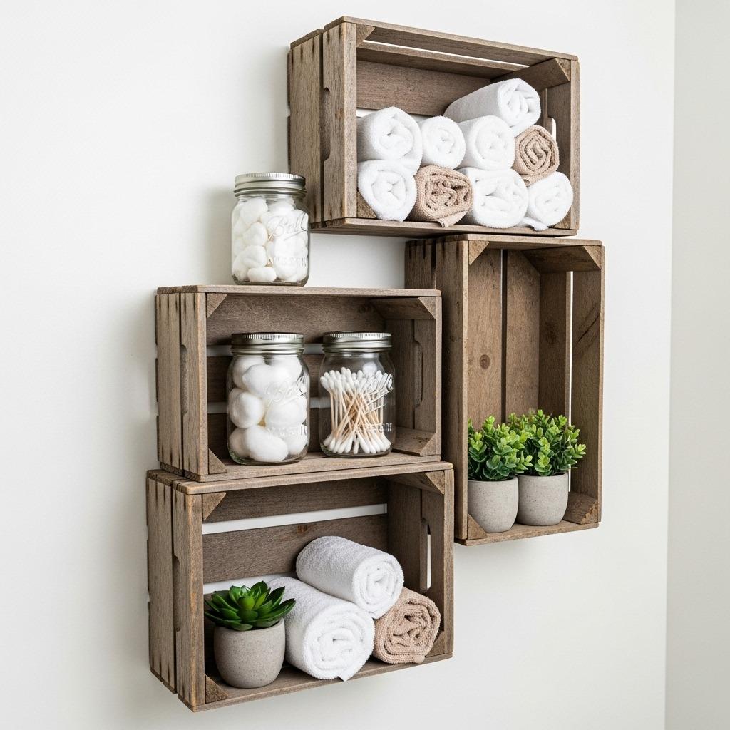 Have a few old wooden crates lying around? They make surprisingly charming wall shelf ideas for bathrooms. The rustic texture adds warmth to sterile bathroom spaces, and the open design keeps everything visible and easy to grab.