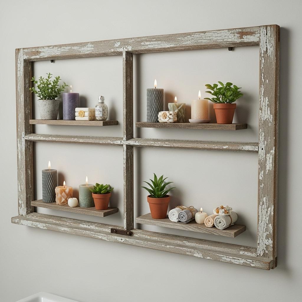 Old window frames make surprisingly charming bathroom shelves. The divided panes create natural compartments, and the vintage character adds personality that new furniture can’t match. You’re basically turning architectural salvage into functional art.