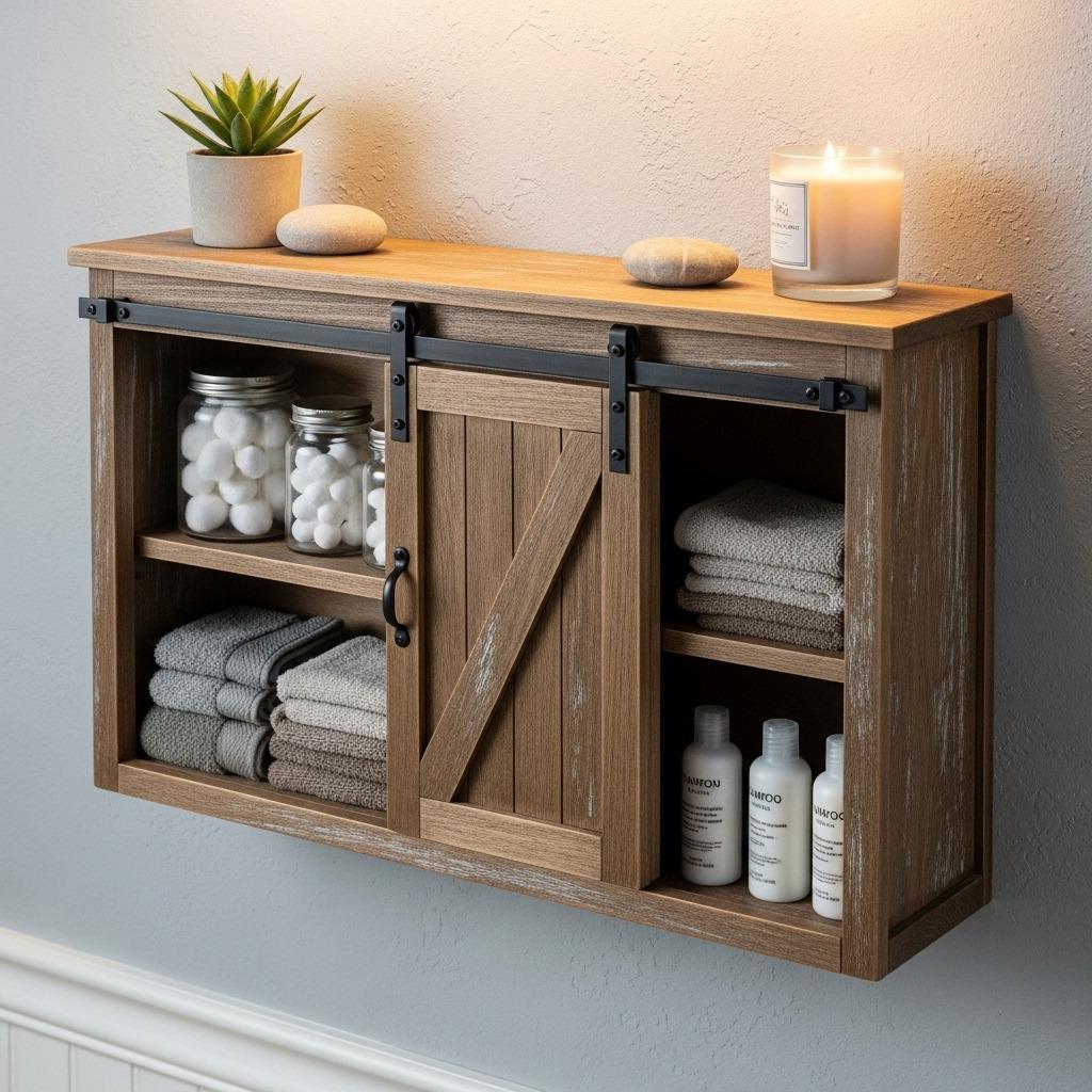 Build or repurpose a shallow cabinet box that fits your wall space. Add interior shelves at heights that suit your storage needs. Install miniature barn door hardware across the top and hang a door that covers half or all of the opening. You can DIY the door from reclaimed wood or buy pre-made options.
