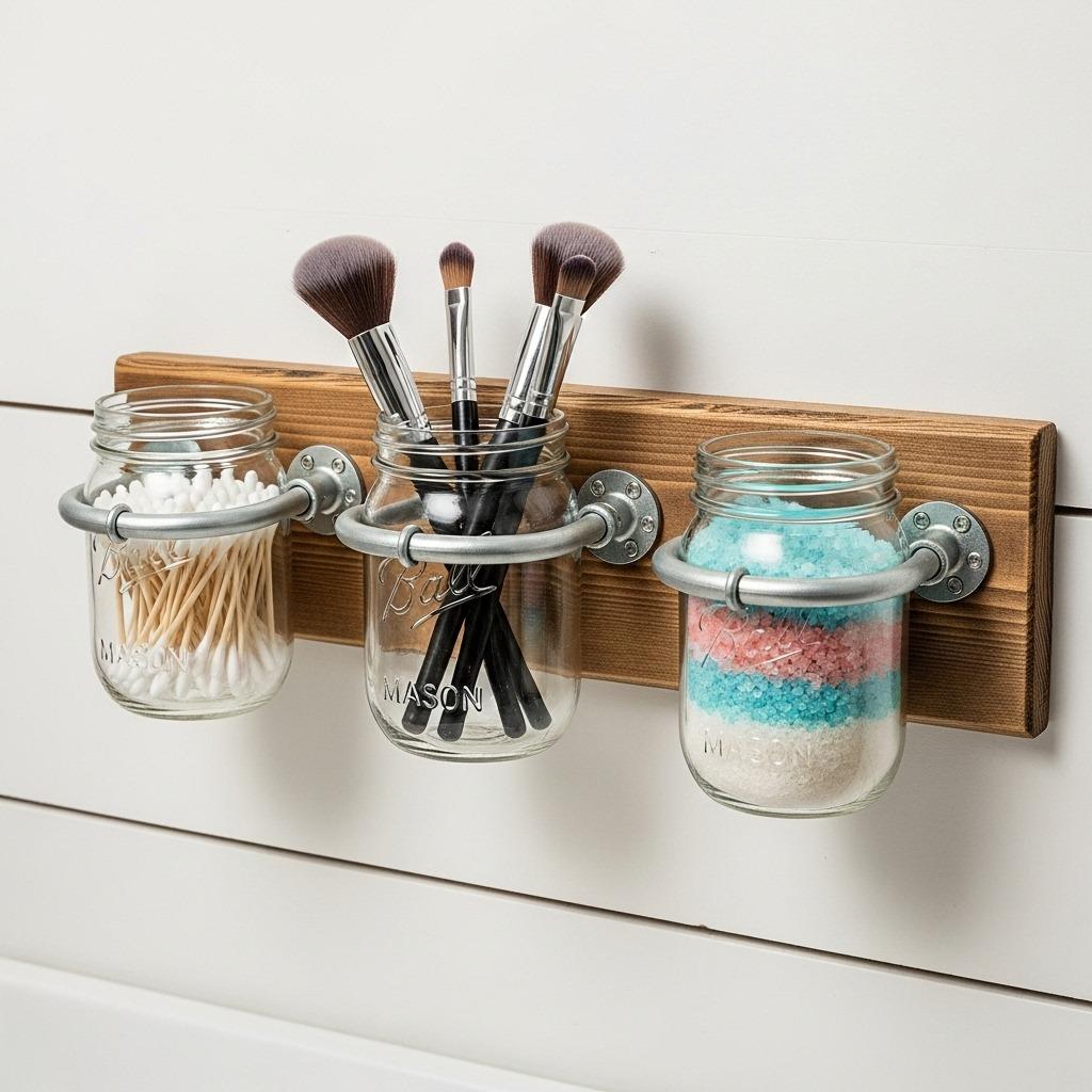 Mason jars aren’t just for the kitchen. Mounted to a backing board, they become surprisingly practical bathroom organizers for small items that usually clutter drawers. Cotton balls, Q-tips, makeup brushes – everything stays visible and dust-free.