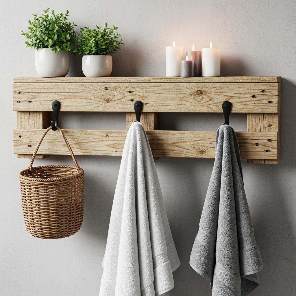 Disassemble a pallet carefully to preserve the best boards. Sand them well – pallets can have rough spots you don’t want snagging your towels. Mount the wood securely, then add a narrow shelf along the top and hooks along the bottom. You can space hooks based on what you’ll hang: closer together for washcloths, further apart for robes.