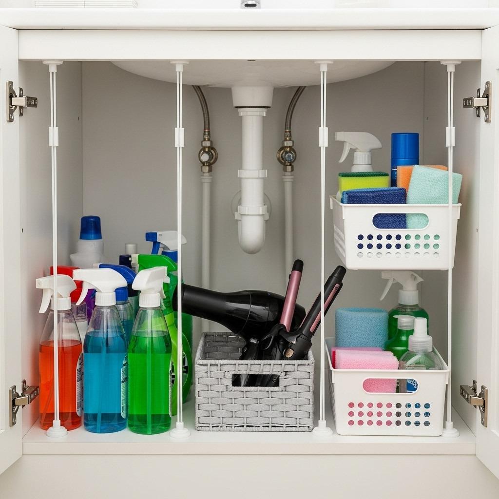 The cabinet under your bathroom sink is probably a chaotic jumble of products. Tension rods can organize that space without a single tool. Running them vertically creates dividers that keep bottles upright and categories separate.