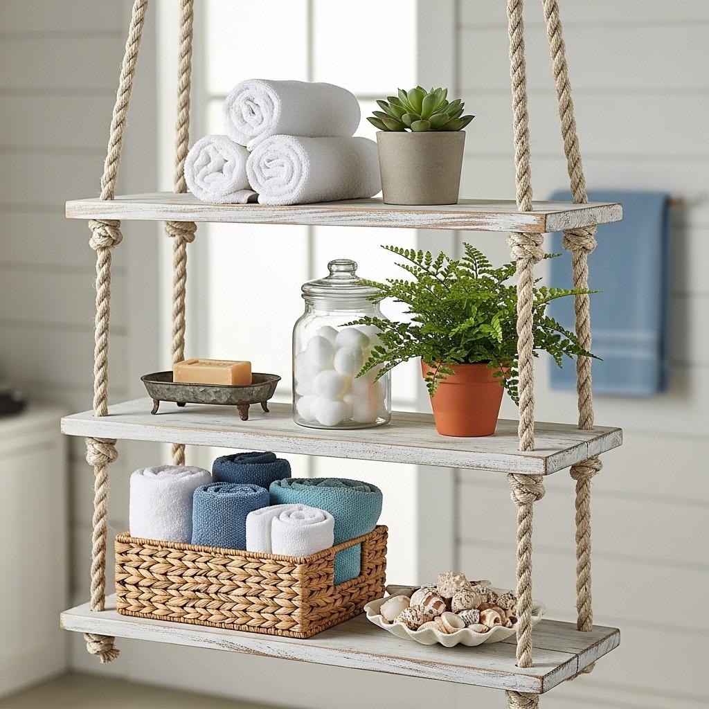 Hanging shelves add storage without taking up any wall or floor space – they simply suspend from the ceiling or a sturdy hook. The rope-and-wood version brings organic texture that softens hard bathroom surfaces. It’s also one of the more forgiving practical shelving projects for beginners.