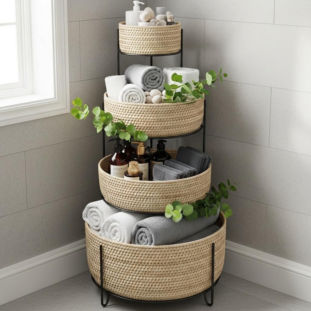 Sometimes the best shelving isn’t shelving at all – it’s baskets. A tiered basket tower gives you the storage of shelves with added texture and concealment. Wire or woven baskets work equally well depending on your bathroom’s style direction.