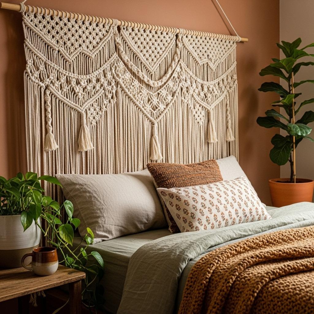Macramé brings handcrafted artistry and bohemian soul into bedrooms. The knotted rope work creates impressive texture while maintaining an airy feel that doesn’t visually weigh down spaces.