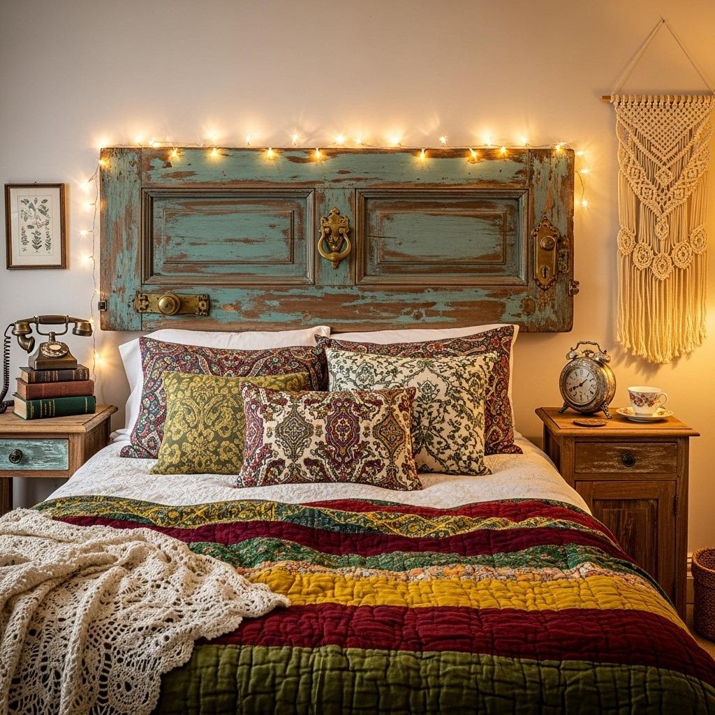 Mounting typically requires securing the door to sturdy wall anchors or building a simple frame. The horizontal orientation works best for most bed sizes, though tall French doors can create striking vertical statements. This approach aligns perfectly with vintage bedroom aesthetics.