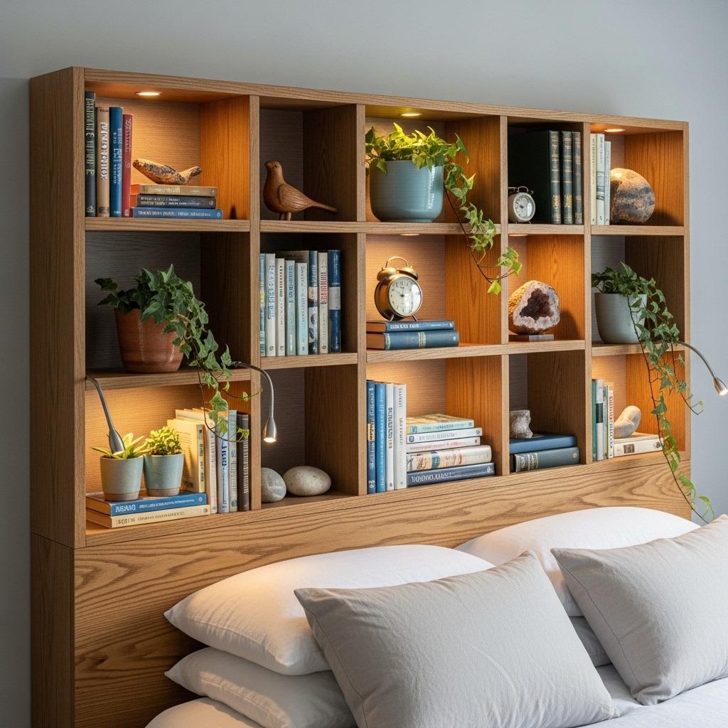 Depth matters here – shallow shelves (6-8 inches) work for books and small items without overwhelming the space. Consider adding LED strip lighting or small reading lamps integrated into the design for both ambiance and functionality.