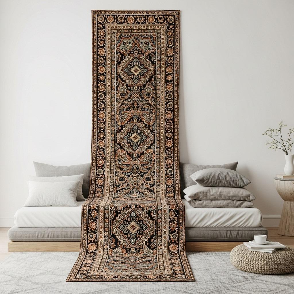 Space the tapestries with intentional gaps between them – about 6-8 inches of negative space lets each piece breathe while creating rhythm across the wall. This approach works beautifully in rooms with low ceilings where you want to draw attention sideways rather than up.