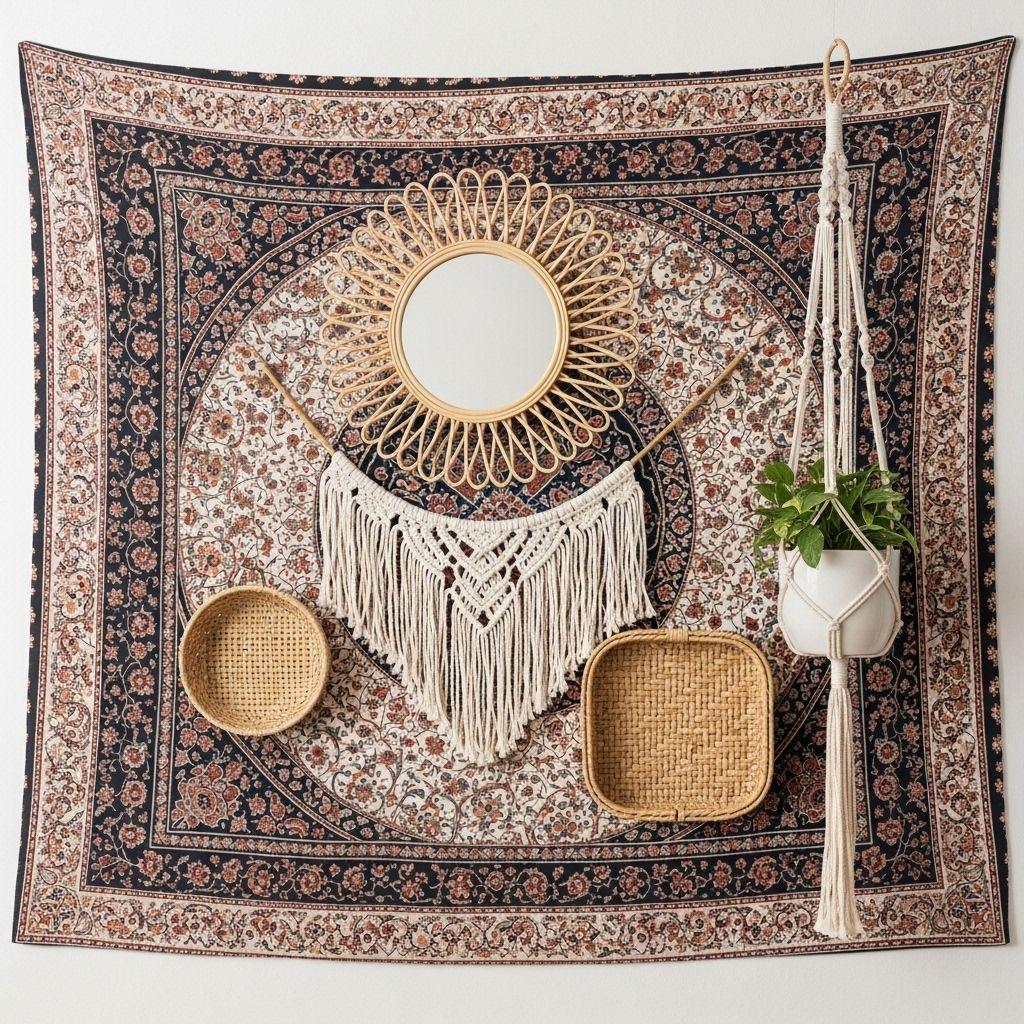 Start by hanging the tapestry as your base layer, then layer smaller elements in front. Woven baskets, macramé plant hangers, small mirrors, and framed art can all float in front of the textile backdrop. This layered approach adds incredible depth and creates that collected-over-time aesthetic central to bohemian pillows and throws styling.