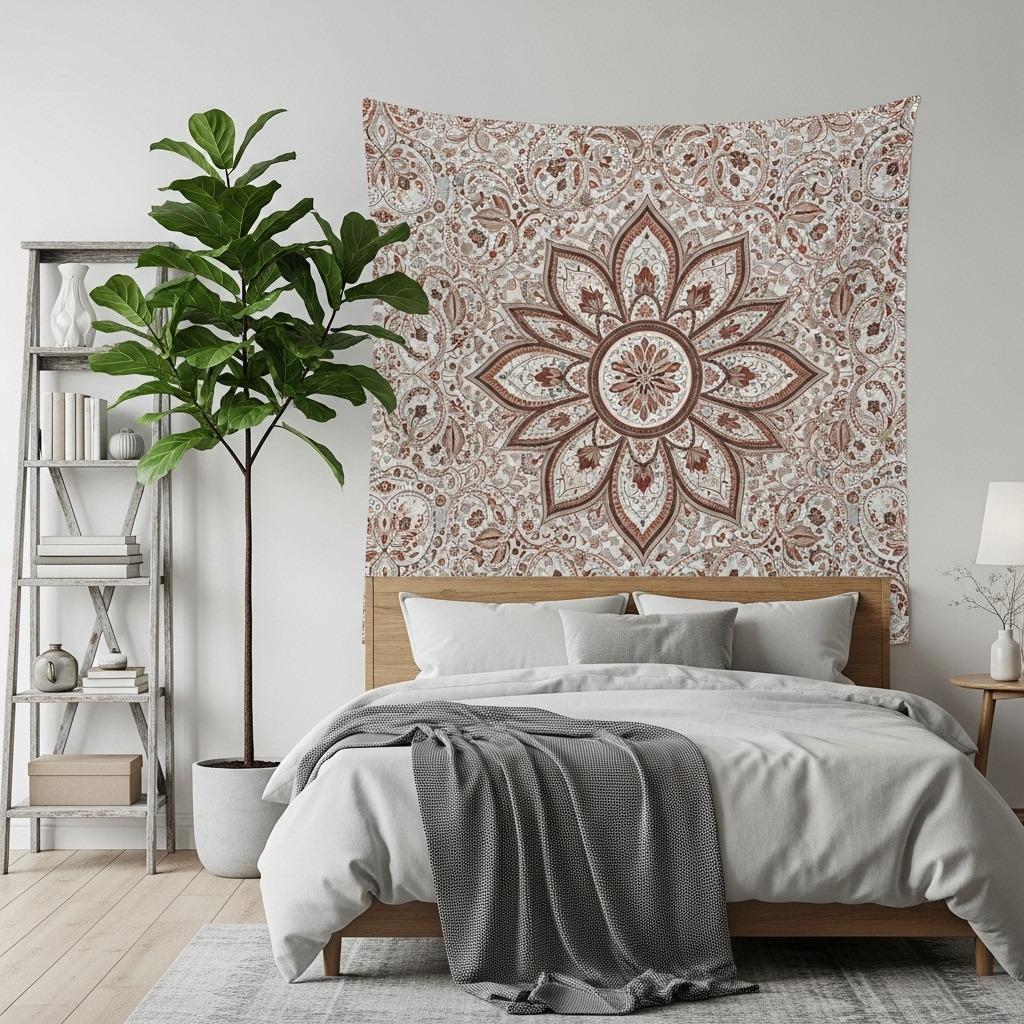 Skip the traditional headboard entirely and let a large-scale mandala tapestry take center stage. The circular geometry naturally draws the eye and creates a focal point that feels both grounding and artistic.