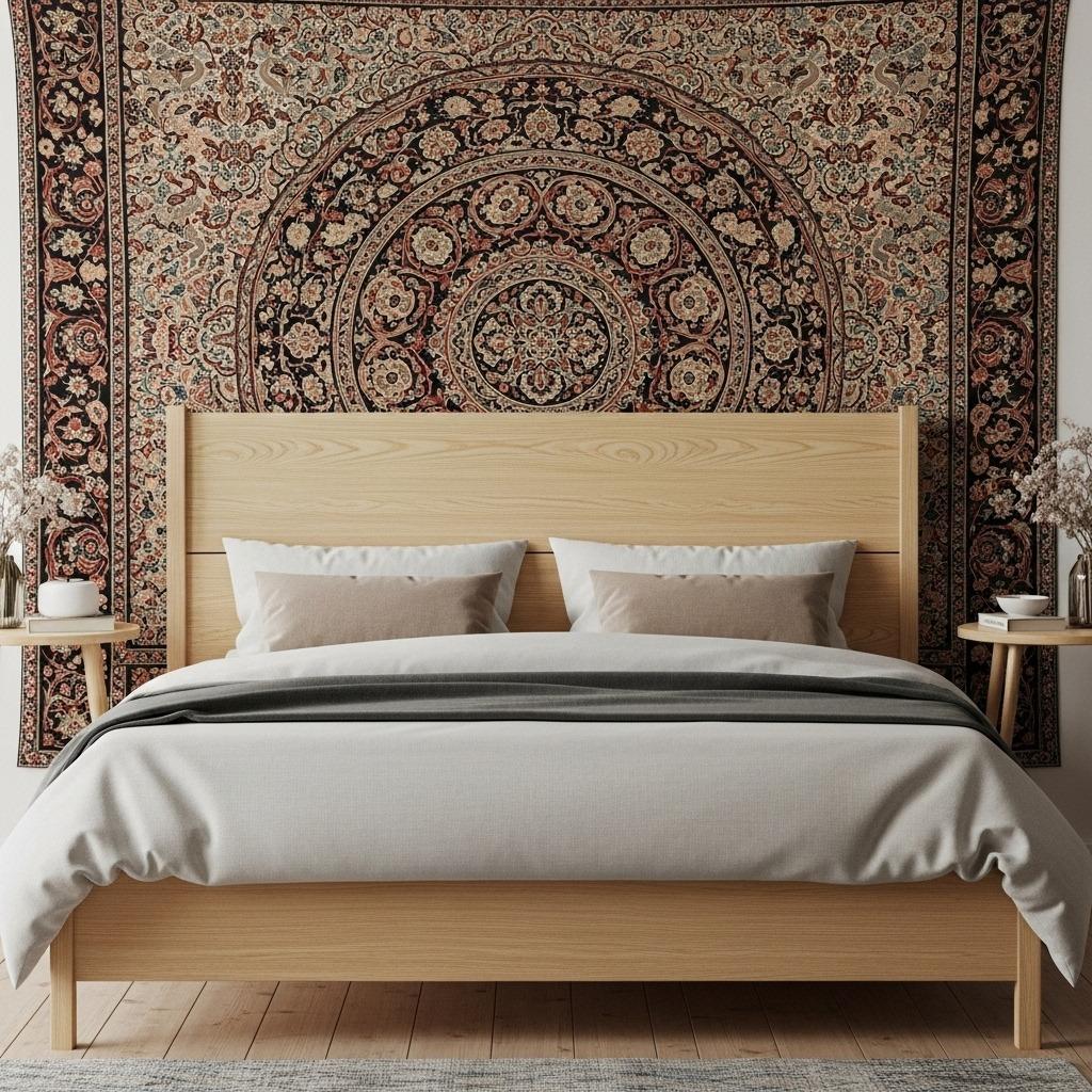 Create an elevated focal point by mounting a tapestry high on the wall as a bed crown. This vertical placement draws the eye upward and makes standard-height ceilings feel taller – a valuable trick in typical bedroom dimensions.
