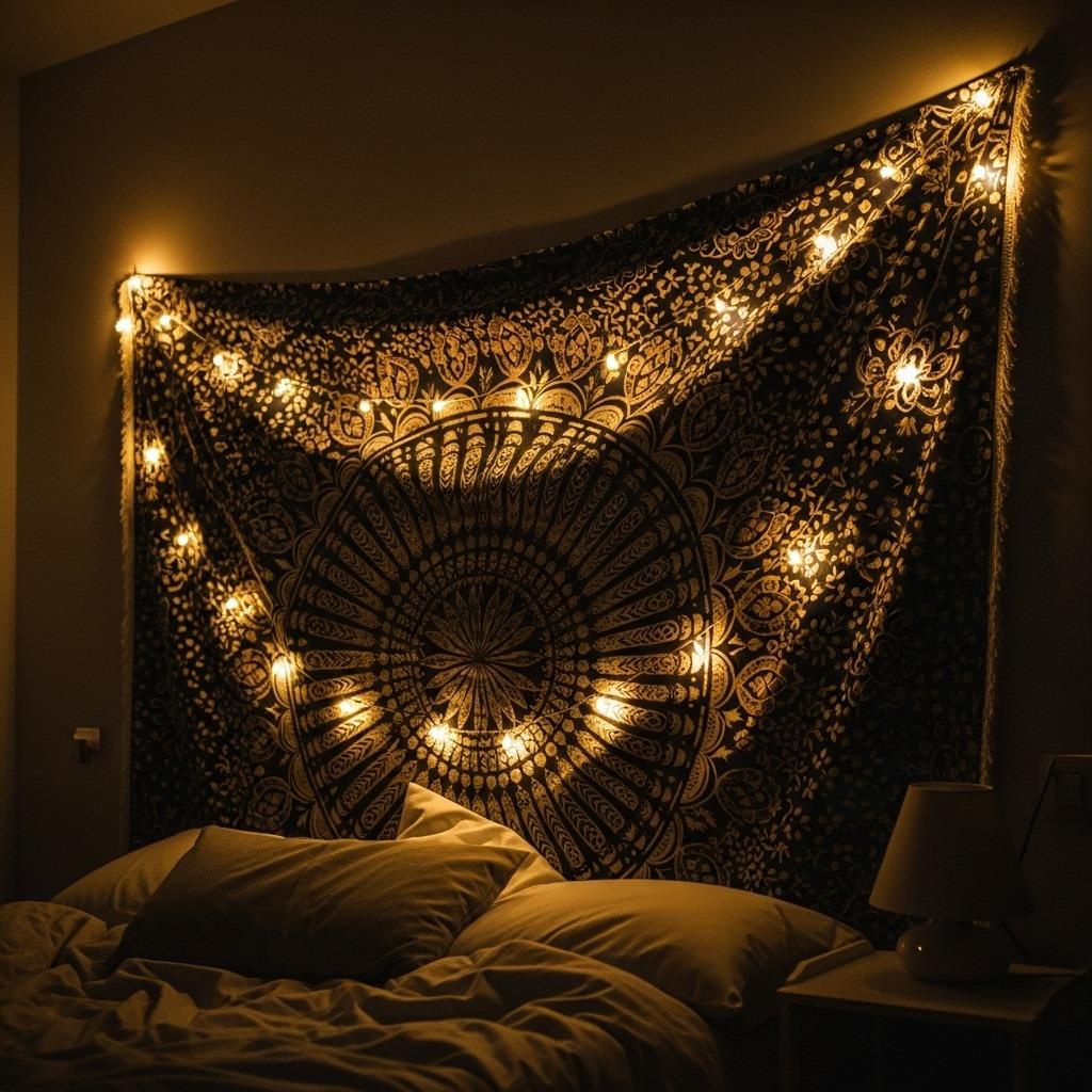 Enhance your bohemian tapestry with strings of warm fairy lights woven through or draped in front of the fabric. The combination creates ambient lighting that highlights the tapestry’s texture while adding functional illumination.