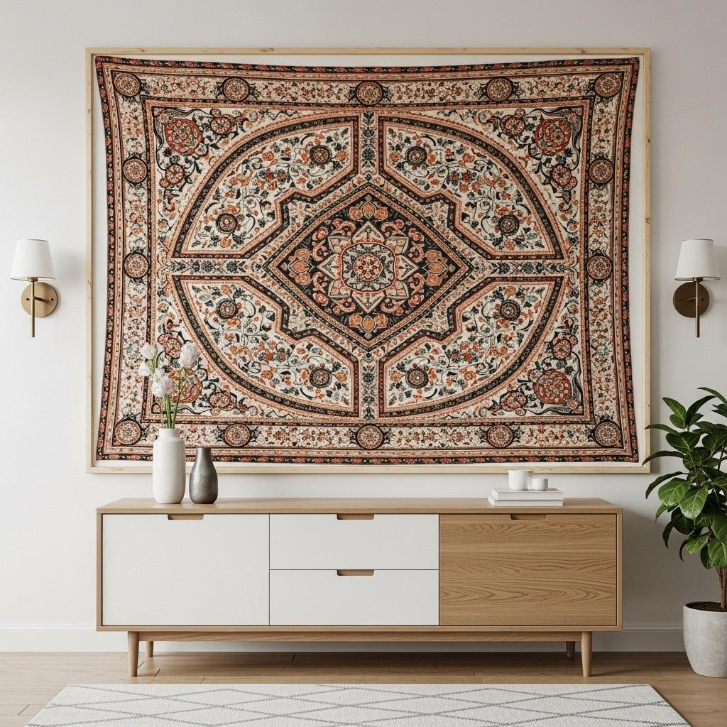 Choose a tapestry with a particularly striking section or pattern detail worth highlighting. The frame creates boundaries that make the piece feel more curated and intentional while protecting the textile from dust and fading.