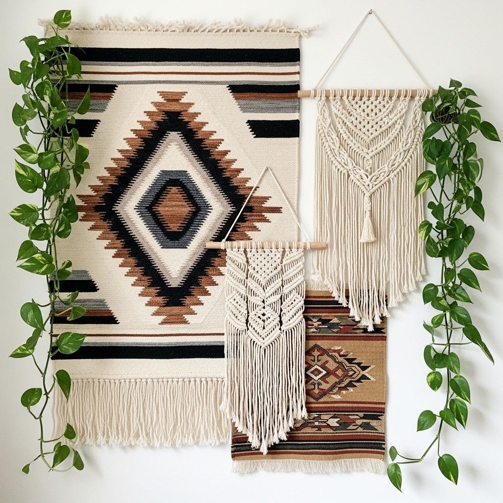 Start with your largest piece as the anchor, then build around it with smaller woven wall hangings, macramé pieces, or vintage textiles. Leave intentional negative space between items – you’re not trying to cover every inch of wall, just create visual interest.