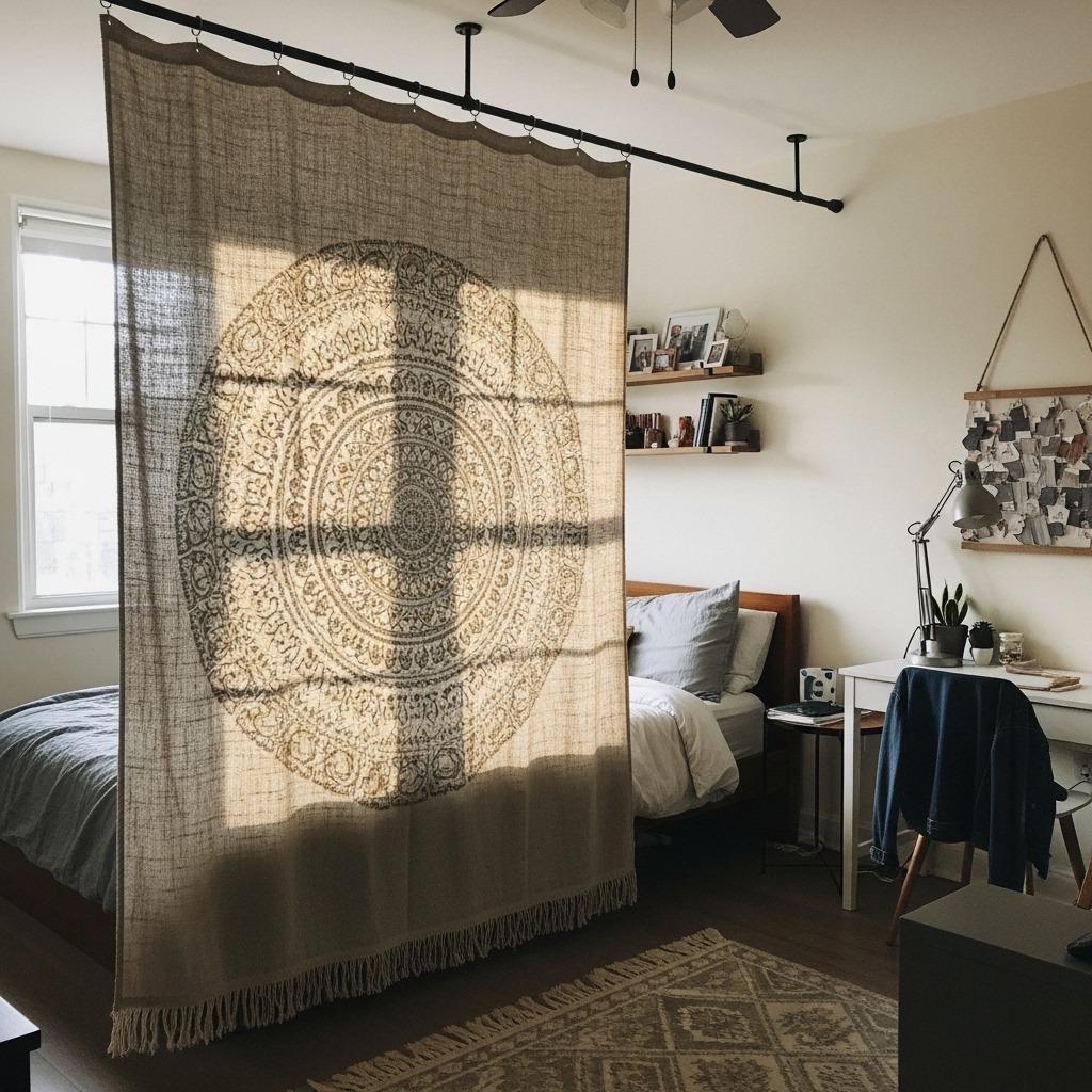 In studio apartments or open-concept bedrooms, a bohemian tapestry makes an excellent space divider that defines zones without blocking light. Mount a ceiling track or tension rod to suspend the tapestry, creating a flexible partition you can open or close as needed.
