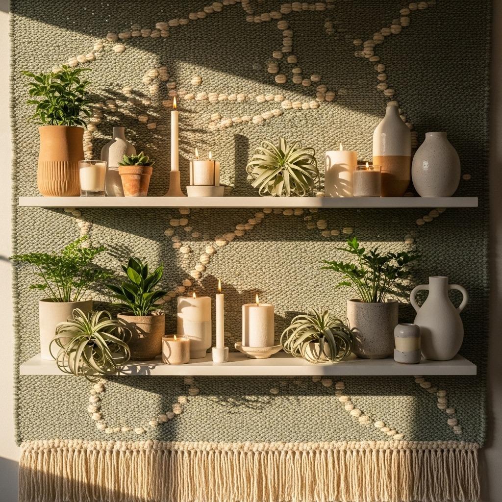 Choose tapestries in muted tones if your shelves hold colorful objects, or go bold with pattern if your display items are neutral. The contrast between hard shelving materials and soft textiles creates appealing tension according to modern accent wall ideas.