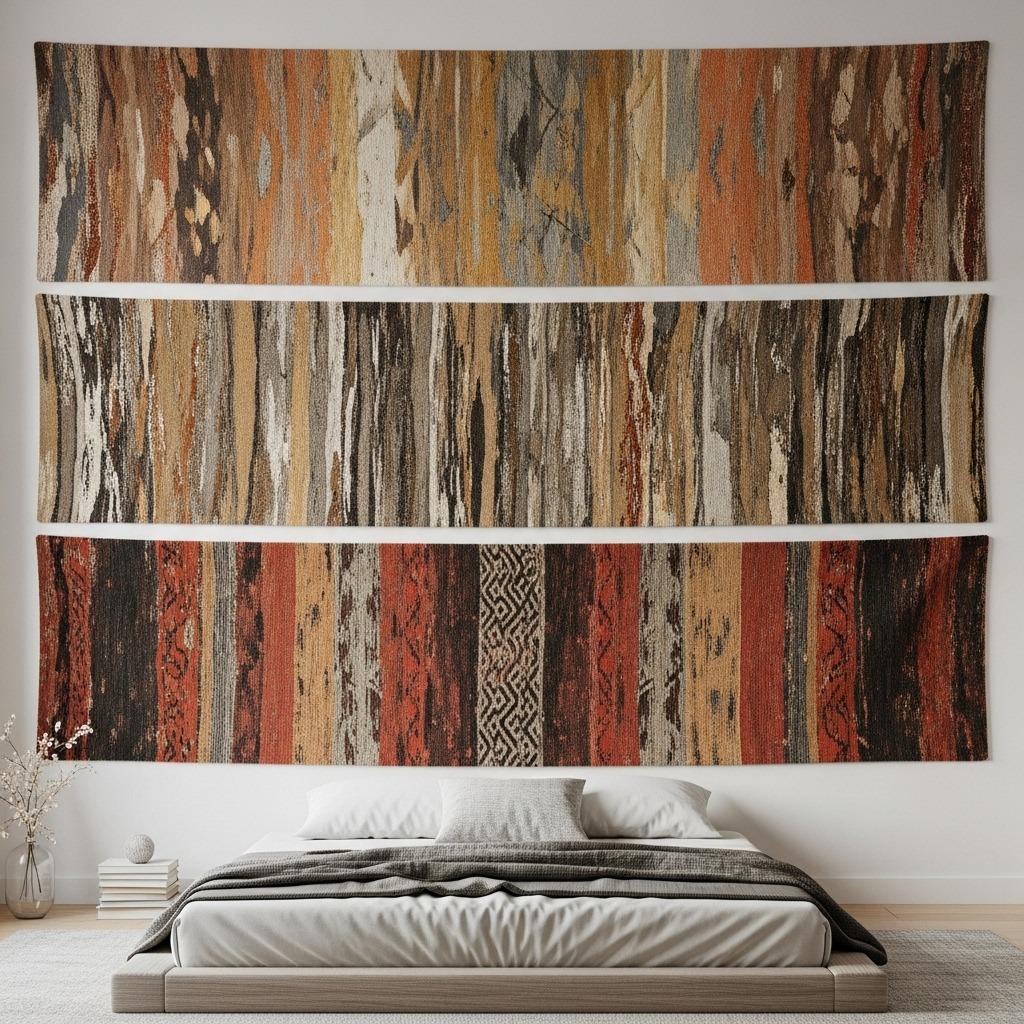 Challenge traditional vertical hanging by mounting multiple narrow tapestries or woven runners horizontally across your wall. This creates striped visual interest that emphasizes the room’s width rather than height.