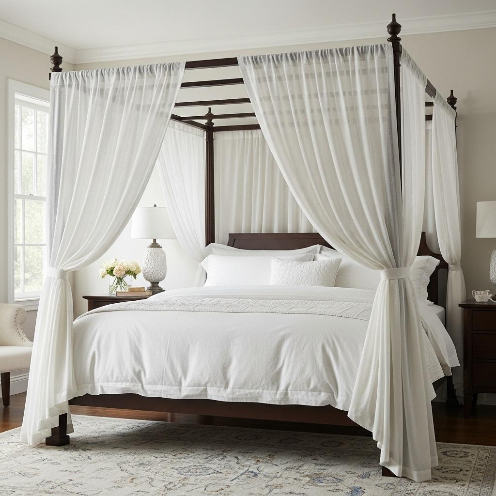 For the best effect, mount your curtain rods or use a four-poster frame that’s at least 7-8 feet tall. The extra height creates more dramatic draping and makes the whole setup feel intentional rather than cramped. Pair this with crisp white bedding and maybe some textured throw pillows to keep things from looking too flat.