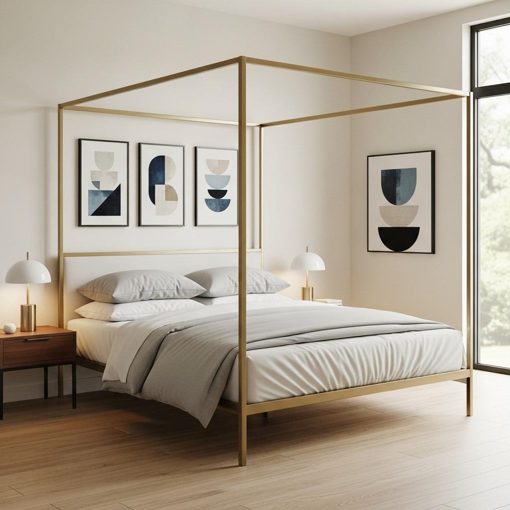 The beauty of brass is its versatility. In modern spaces, let the frame stand alone as sculptural art. In more traditional or transitional bedrooms, add flowing curtains to soften the look. The metal’s natural patina develops character over time, or you can maintain the polished shine with regular cleaning.