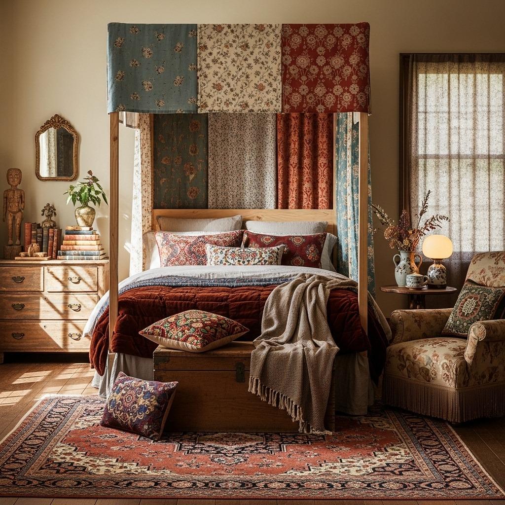 This is an excellent project for using up beautiful fabric remnants or repurposing vintage textiles. You might incorporate antique lace, printed cotton, embroidered panels, or even lightweight quilts. The collected-over-time feeling this creates makes your bedroom feel genuinely lived-in and loved rather than catalog-perfect.