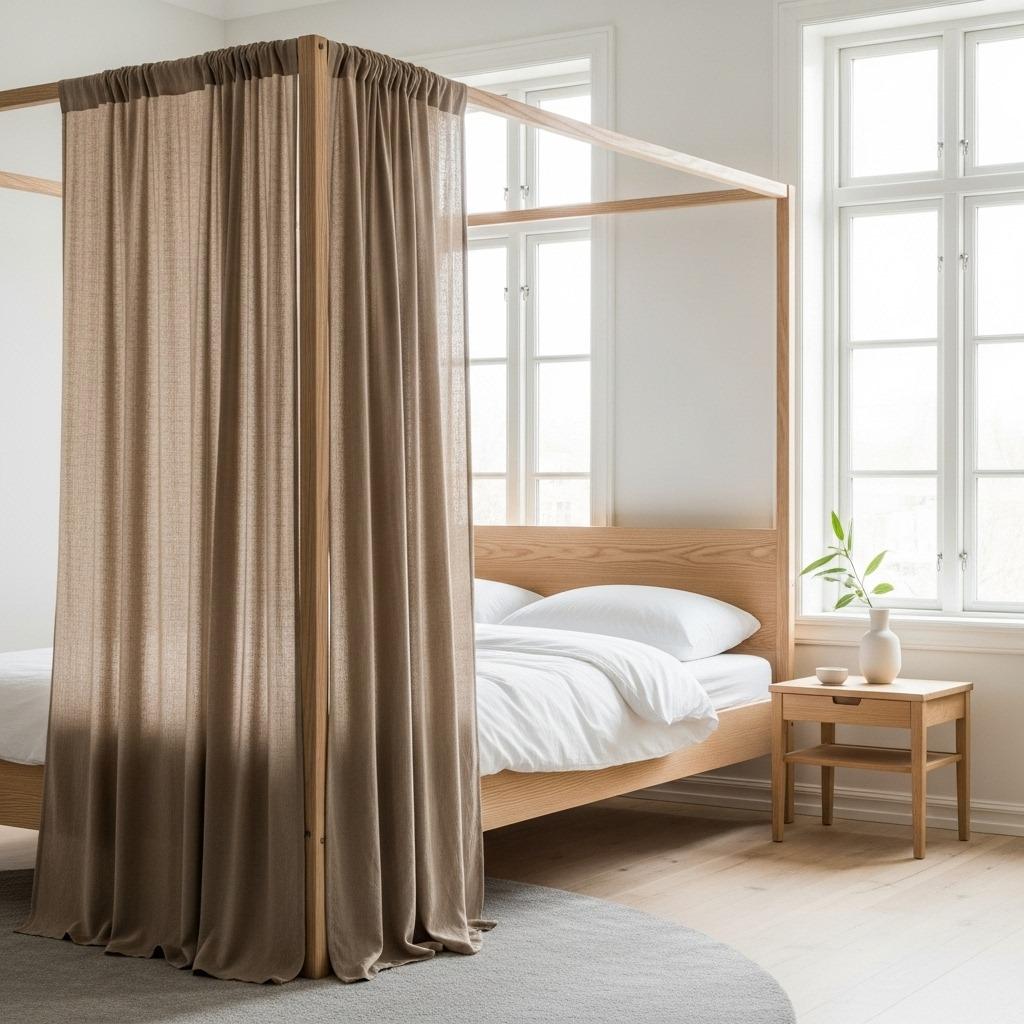 Scandinavian design principles create canopy beds that feel serene and uncluttered. Natural linen in oatmeal, beige, or soft gray provides just enough definition without overwhelming the space. The focus stays on quality materials, clean lines, and that signature Nordic coziness.