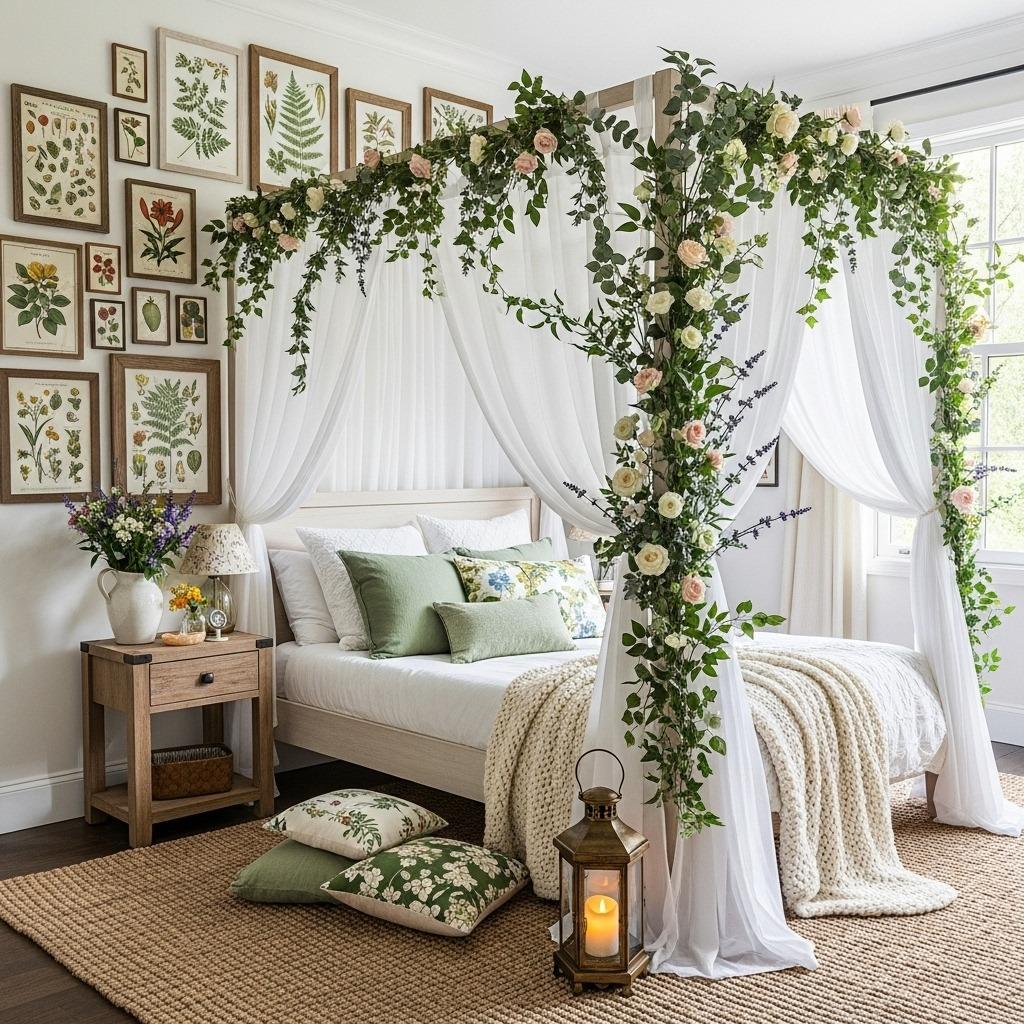 Bringing nature indoors through your canopy design creates an enchanting garden-room feeling. Weave faux or real greenery through curtain rods or across the top of your frame, adding flowers for pops of color. This approach works beautifully for anyone who loves botanical style or wants to connect their indoor space with their outdoor garden.