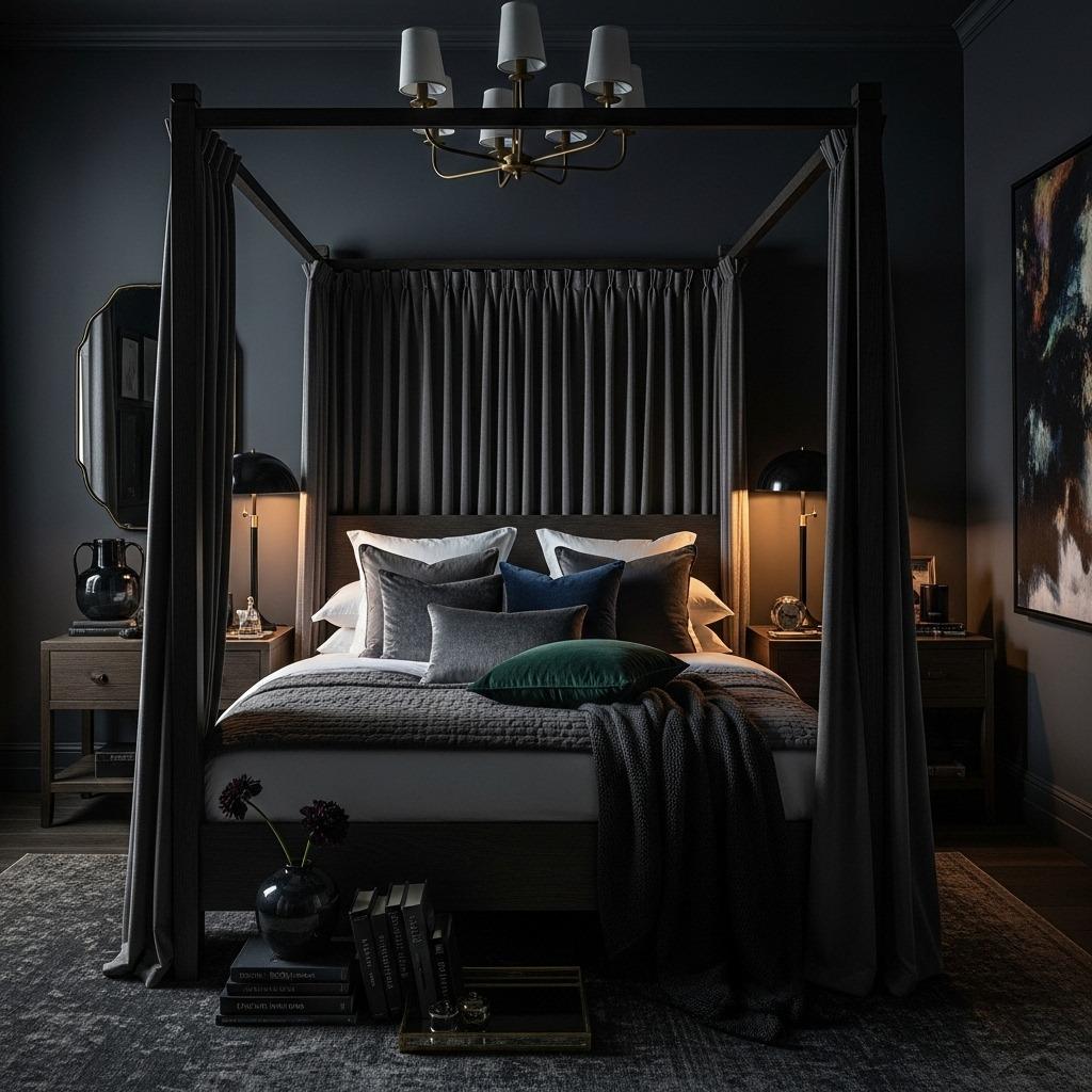 Dark, moody bedrooms have become incredibly popular, and a dark canopy takes this aesthetic to the next level. Charcoal, navy, forest green, or even black curtains create an incredibly cocooning effect that’s perfect for deep sleep and dramatic style. This isn’t for everyone, but if you love bold design choices, it’s absolutely stunning.