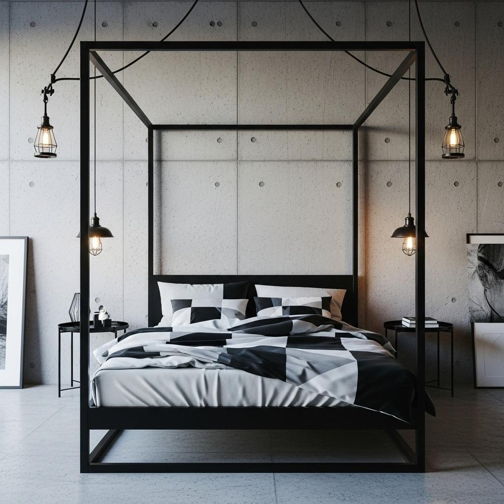 Not every canopy needs fabric to make an impact. A simple black metal frame creates architectural interest while keeping things refreshingly modern. This works especially well in contemporary or industrial loft bedrooms where you want clean lines and a masculine edge.