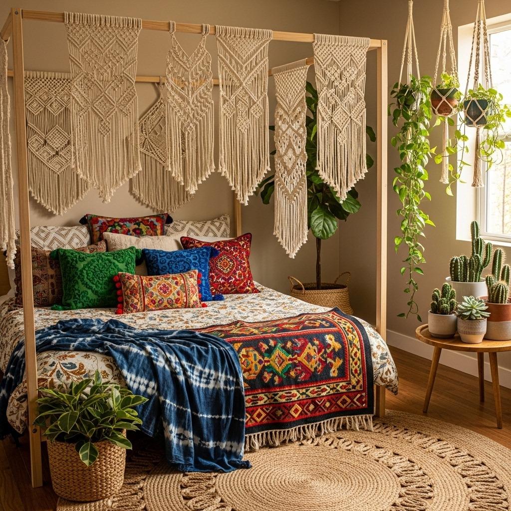 This approach works wonderfully when you want privacy and visual interest without completely enclosing the bed. The open weave of macramé lets air circulate while still defining your sleeping zone. Layer it with patterned textiles, woven baskets, and plenty of plants for that collected-over-time look.