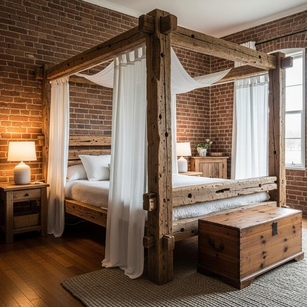 Reclaimed wood beams bring instant warmth and character to any bedroom. This approach works beautifully in farmhouse, rustic, or even eclectic spaces where you want that natural element to take center stage. The wood grain and weathered texture add history and story to your room in a way that metal or painted frames simply can’t match.