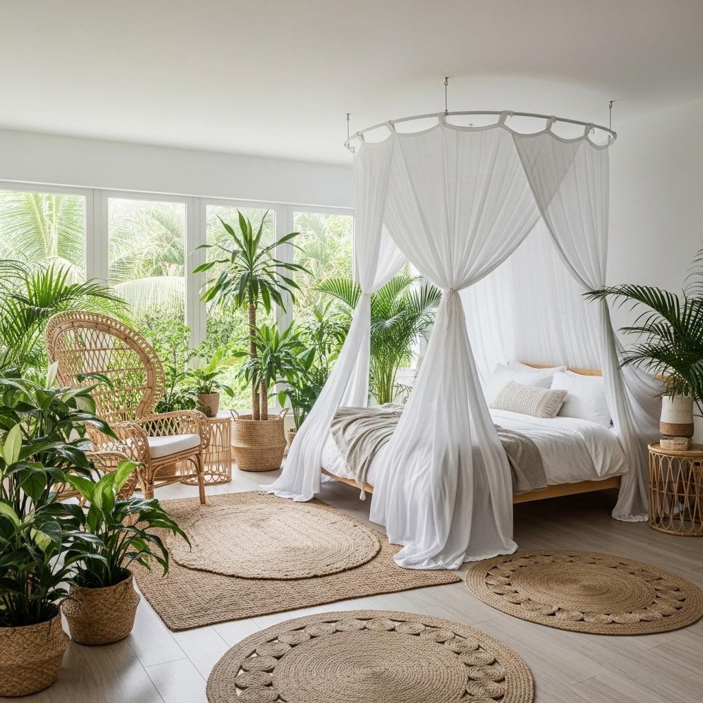 Surround your bed with plenty of greenery, natural fiber rugs, and woven textures to complete the tropical sanctuary feeling. This setup transforms your bedroom into a daily vacation spot, which honestly sounds pretty amazing.