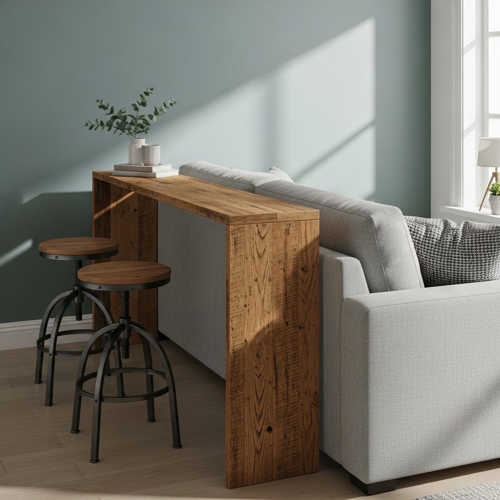 Counter-height tables with ultra-slim profiles slip into spaces standard dining tables can’t reach. Think narrow areas behind sofas, against walls between rooms, or in galley-style spaces. These tables are tall and narrow – often just 12-18 inches deep but running several feet long.