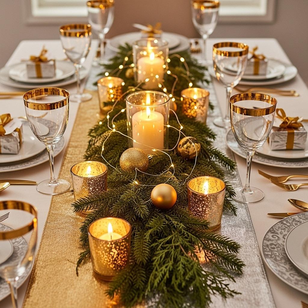 Your centerpiece can be statement-making here. Think evergreen garland woven with metallic ornaments and fairy lights, tall gold candlesticks flanking a floral arrangement with metallic spray-painted branches, or a collection of metallic vases at varying heights. Add small wrapped packages as place card holders or scattered decorative elements. The goal is celebratory elegance that photographs beautifully but still feels inviting enough for a relaxed dinner party.