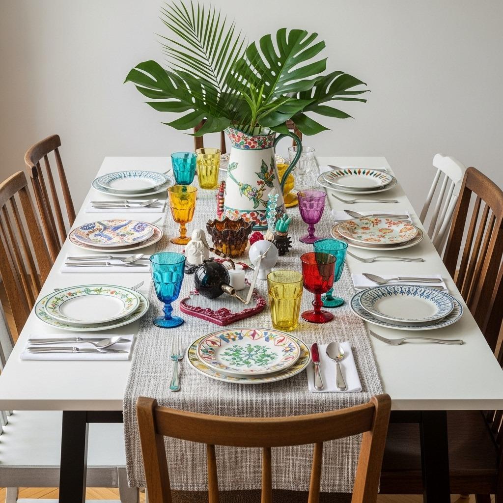 If you’ve ever worried about your table settings “matching,” this approach is your permission to throw that rule out entirely. An eclectic dining room tablescape celebrates personality, collected pieces, and the beauty of combining unexpected elements. Similar to creating an eclectic living room, your table becomes a reflection of your unique style.