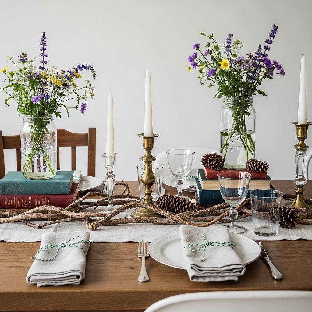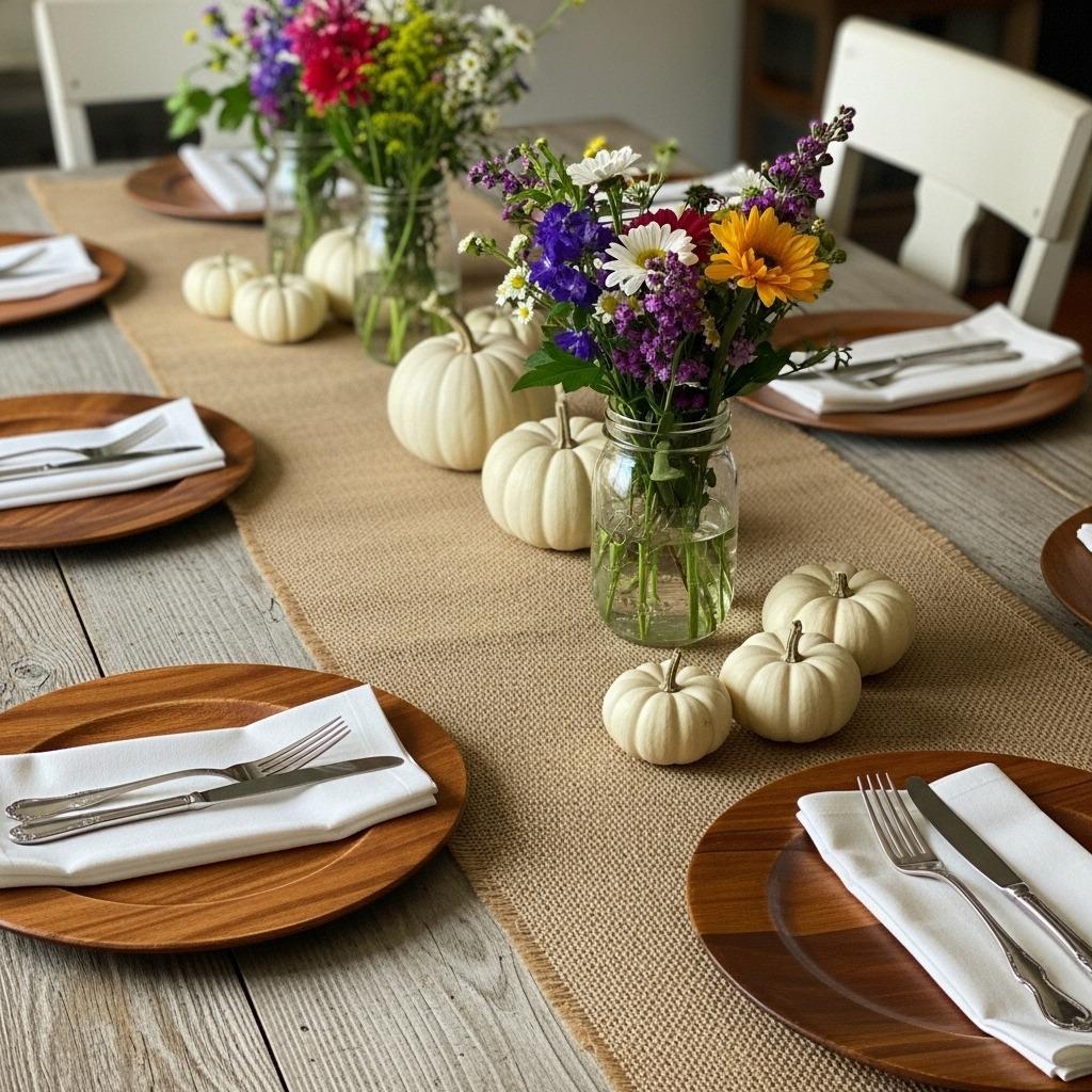 A burlap or linen runner down the center immediately sets the tone. Layer in wooden chargers or simple stoneware plates – nothing too precious or perfect. Mason jars make excellent vases for wildflowers or herb bundles, and they fit the aesthetic perfectly. You could even use them as drinking glasses if you want to commit to the theme.