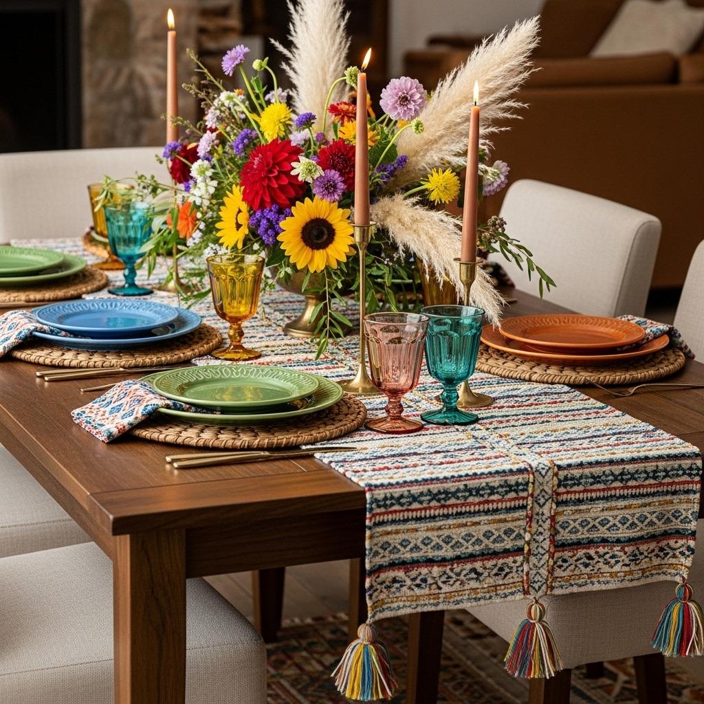 Start with a patterned tablecloth or runner – think bold prints, tassels, or ethnic-inspired designs. Mix and match your plates and glassware rather than using matching sets. Colored glassware, especially in jewel tones, adds instant personality. Don’t be afraid to combine different patterns; boho style thrives on that collected, worldly aesthetic.
