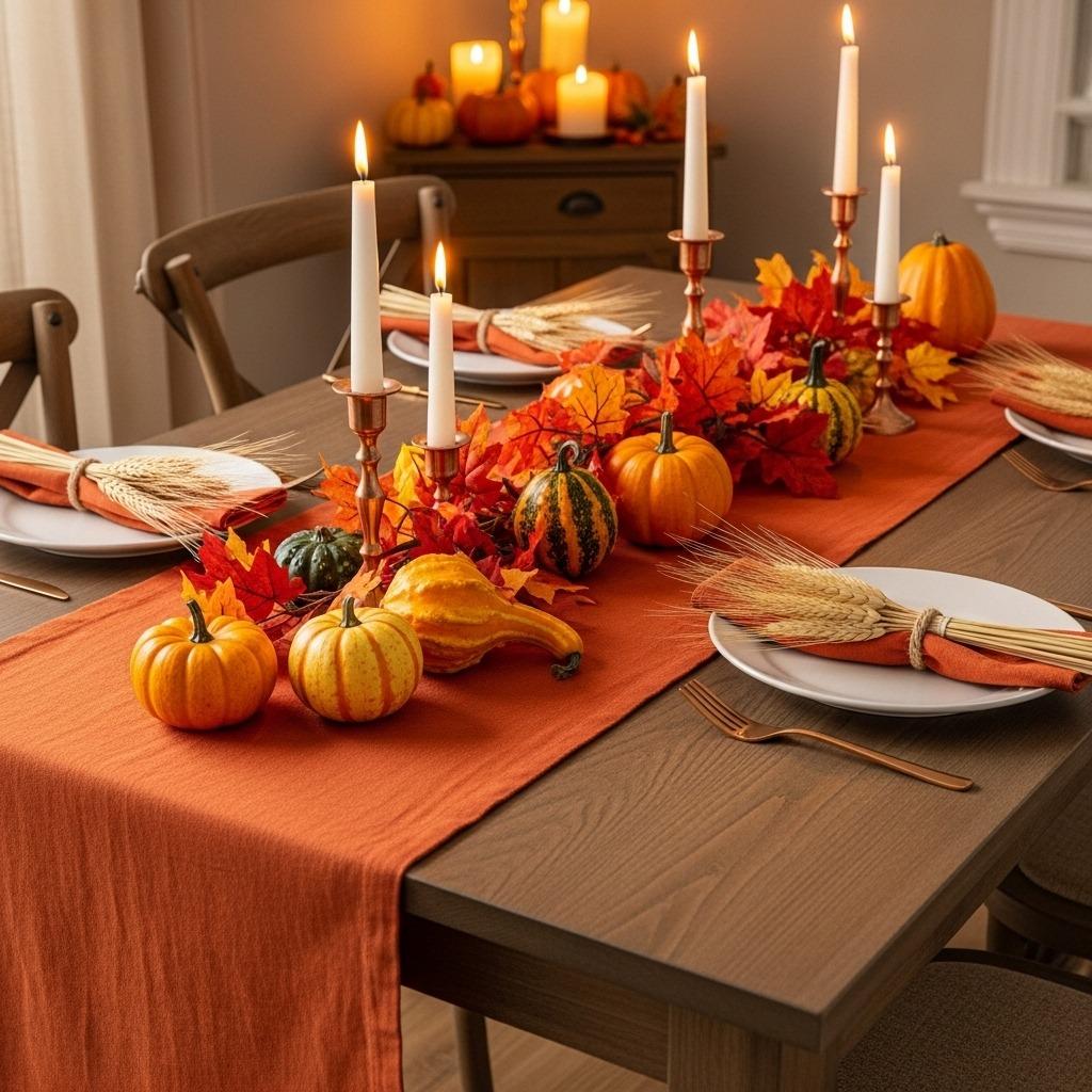 Layer warm-toned linens in burnt orange, deep burgundy, or chocolate brown. Incorporate natural elements like small pumpkins, gourds, and fall leaves as part of your place settings or scattered down the center. Wheat bundles tied with twine make excellent napkin decorations and add to that harvest feeling.