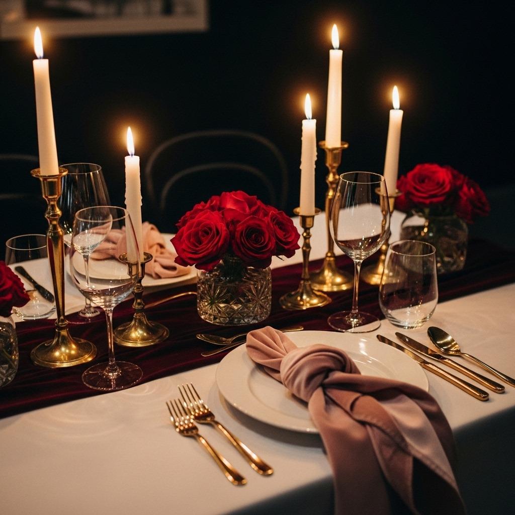 Keep your color palette soft and sophisticated – blush pink, deep wine red, or even rich jewel tones like emerald. Silk or velvet napkins add a luxurious touch without breaking the budget. A simple arrangement of roses or peonies in a low vase won’t block conversation but adds romance. The goal is creating an atmosphere that encourages lingering over wine and dessert long after the plates are cleared.