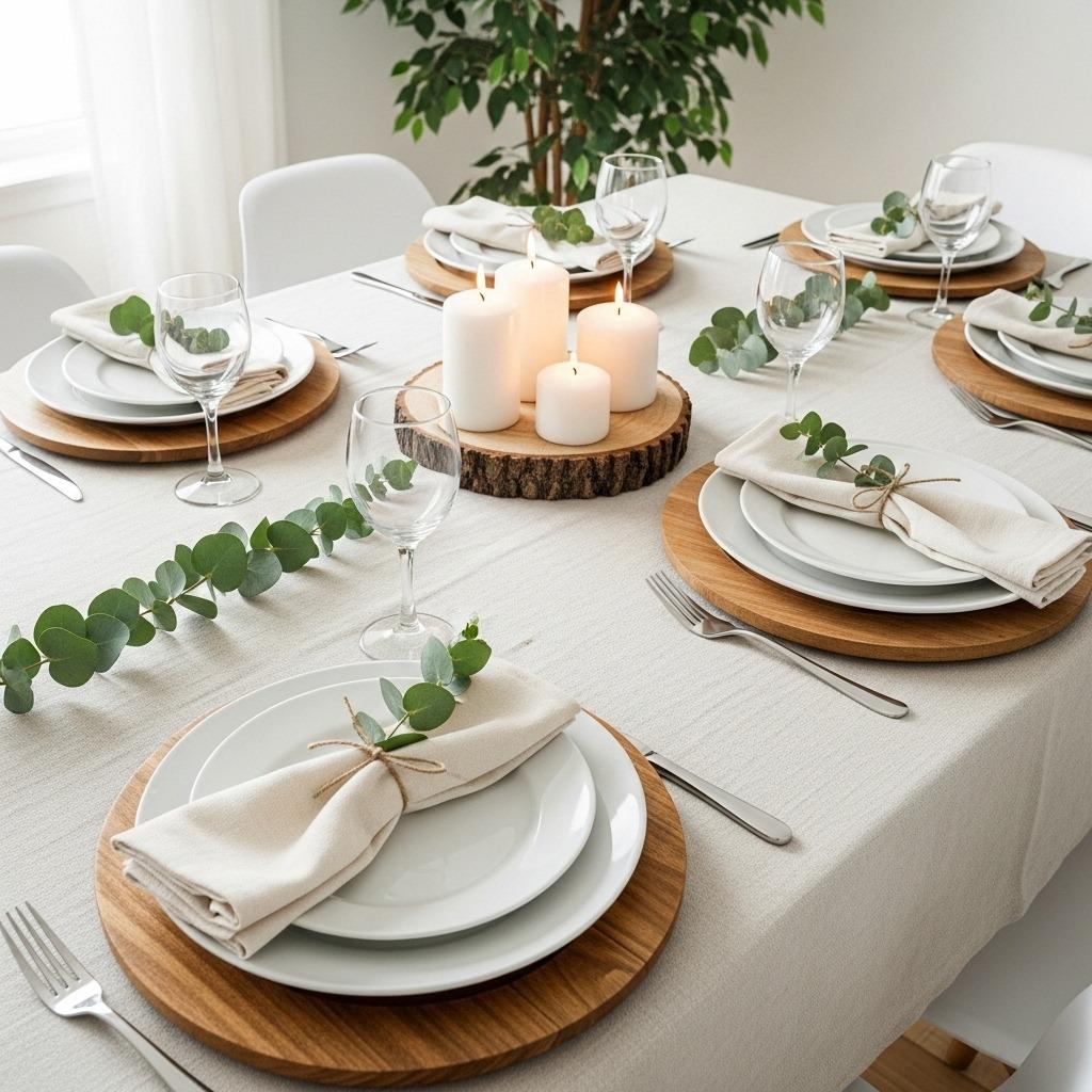 Start with natural wood elements – wooden chargers, a raw wood slice as a centerpiece base, or even a simple wooden table left mostly bare. Use white or cream dinnerware to maintain that clean, airy feeling. Linen napkins in natural tones add softness without cluttering the visual space. The beauty is in the quality of each element rather than the quantity.