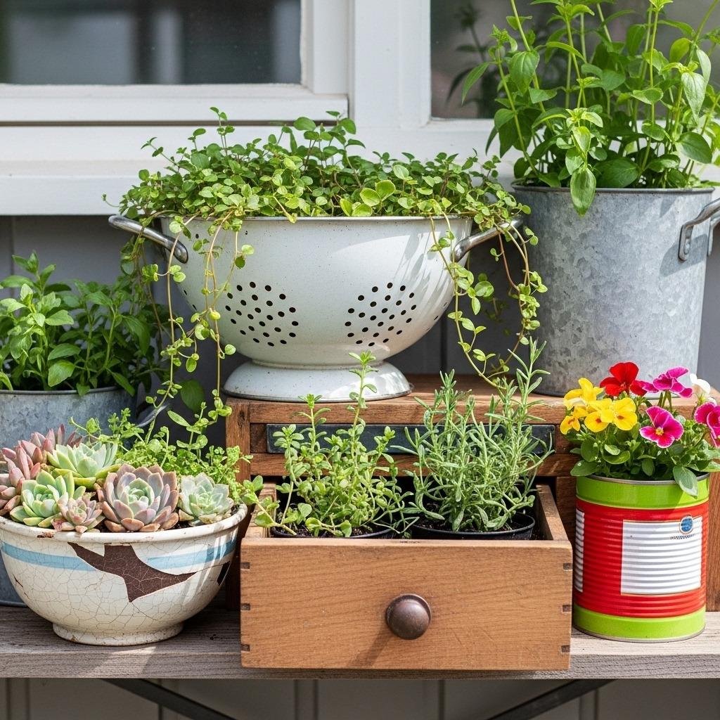 The beauty of upcycled container ideas lies in their uniqueness – nobody else will have identical planters. Thrift stores, estate sales, and your own cabinets offer endless possibilities. Look for items with interesting colors, patterns, or shapes that speak to you. Grouping varied repurposed containers creates an collected-over-time look that’s infinitely more interesting than matching store-bought sets.