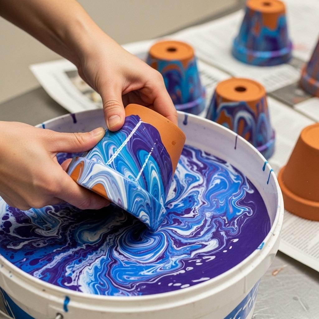 Holding your pot by the interior, slowly dip it into the water at an angle, rolling it through the paint layer. The paint transfers to the pot’s surface in those beautiful marbled patterns. Pull it out carefully, let excess water drip off, and set aside to dry completely.