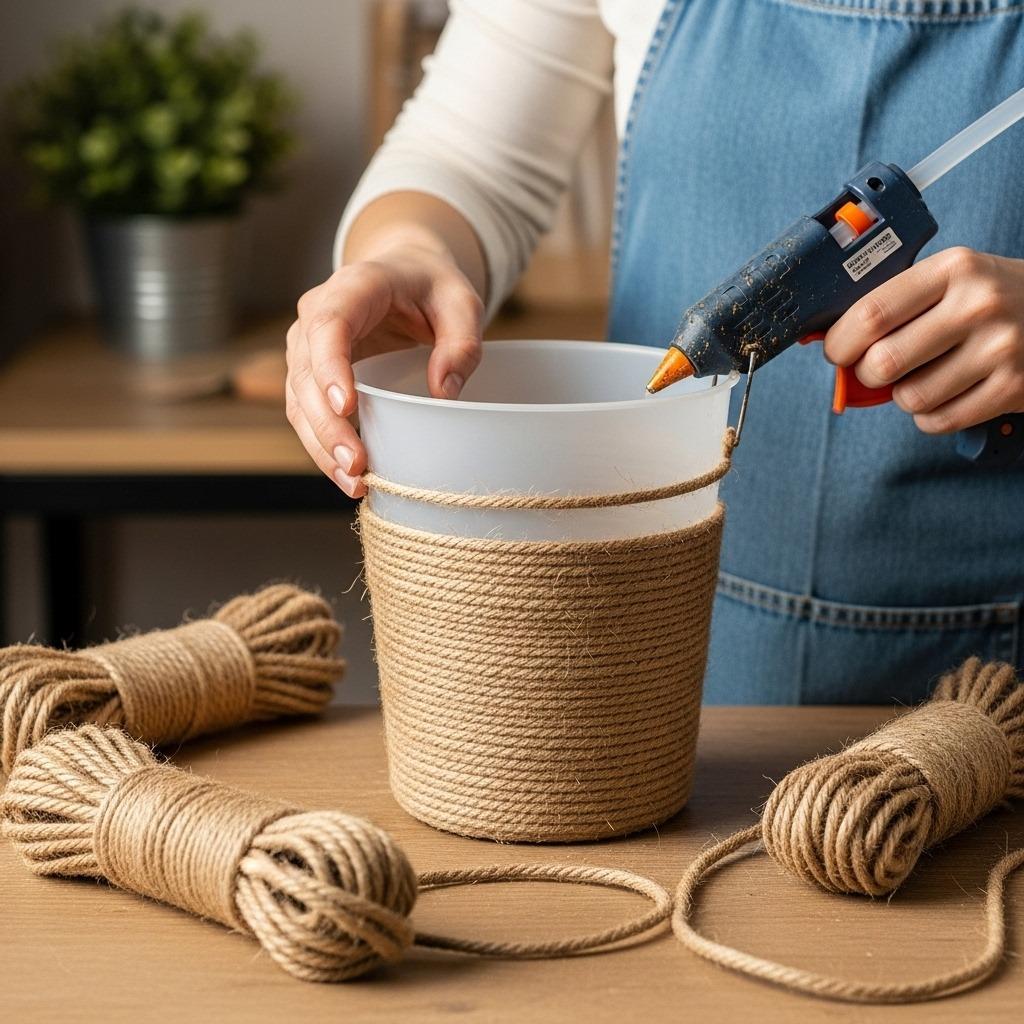 Choose a rope thickness based on your pot size – thinner sisal or jute works for smaller containers, while chunkier manila rope suits larger planters. You’ll need a hot glue gun with plenty of glue sticks since you’ll be working continuously. Start at the bottom of the pot, applying glue in small sections and pressing the rope firmly against it.