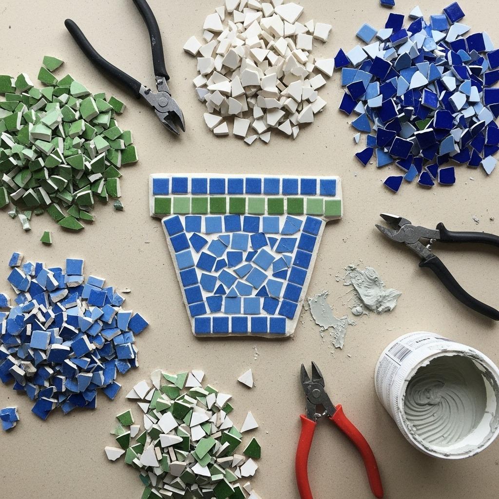 You’ll need tile adhesive, grout, a sponge, and your broken tile pieces. If you don’t have leftover tiles, thrift stores often sell vintage plates and ceramic pieces for pennies. Wrap them in an old towel and tap gently with a hammer to create workable fragments. Sort pieces by color or pattern before starting to visualize your design.