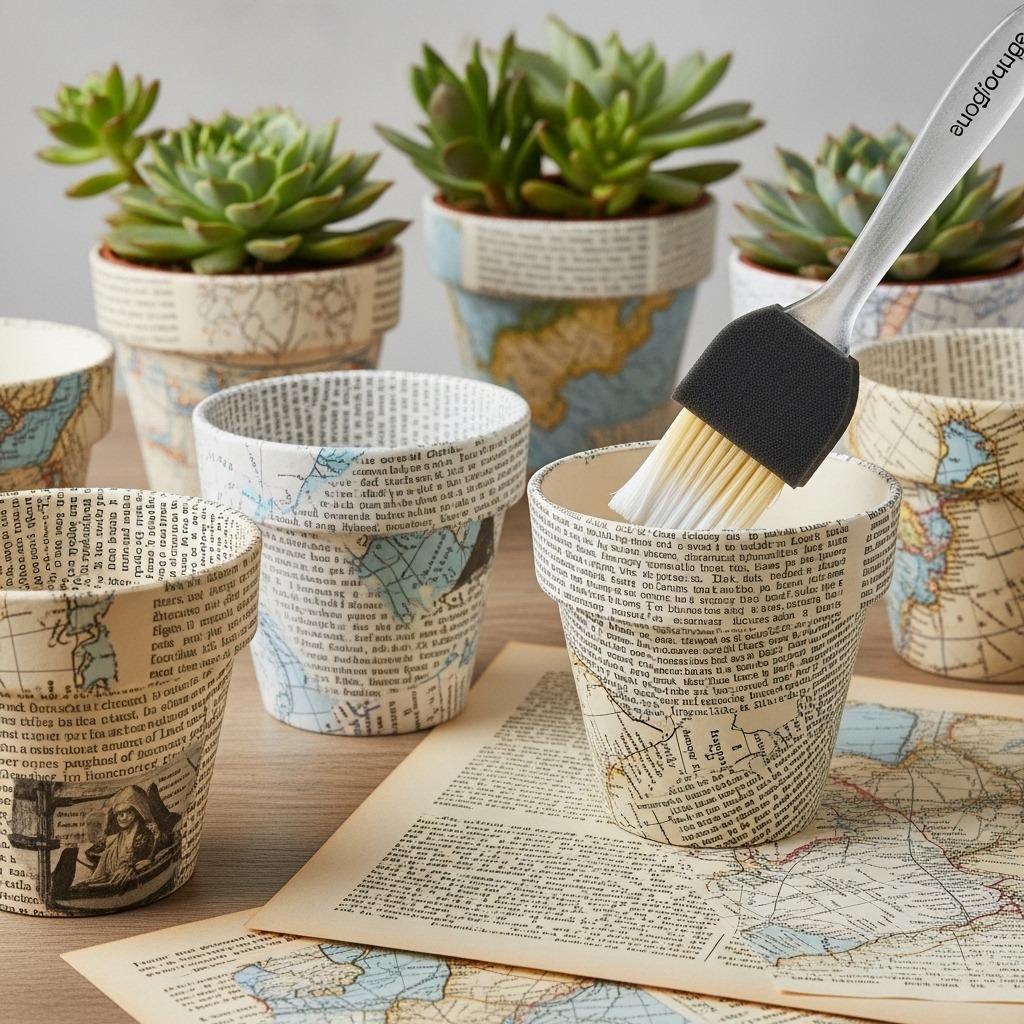 Upcycled container ideas don’t get much more charming than planters covered in vintage book pages or old maps. This technique breathes new life into damaged books, outdated atlases, or sheet music that’s too worn for its original purpose. The result looks curated and intentional without being overly precious.