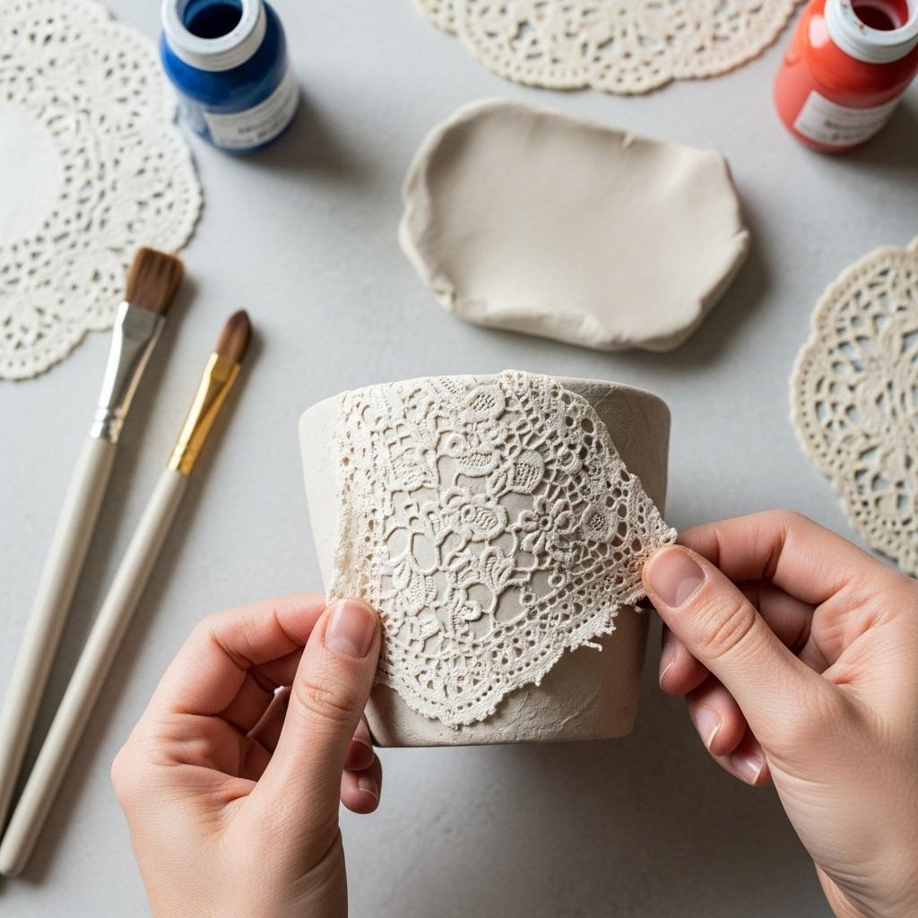 You’ll need lace fabric (vintage doilies work wonderfully), air-dry clay or joint compound, and acrylic paint. Roll out your clay or spread joint compound onto the pot’s surface in a relatively even layer. Press lace firmly into the wet medium, using a rolling pin or your hands to ensure good contact with all the pattern details.